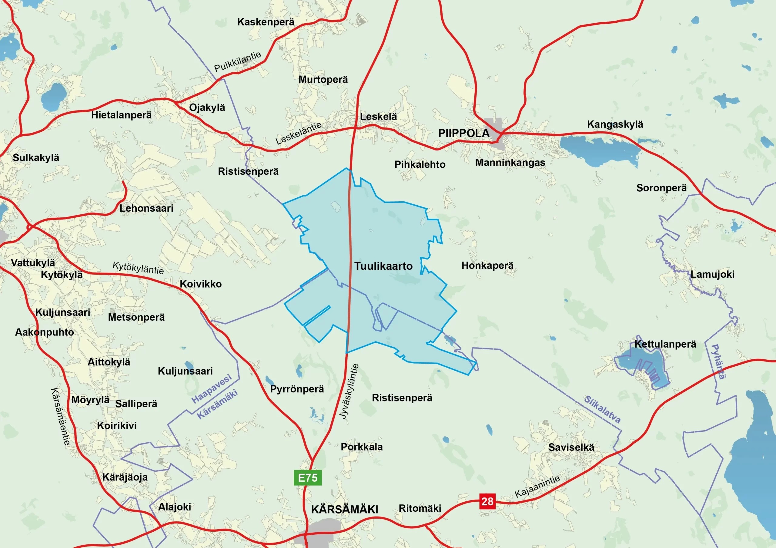 The Tuulikaarto project area is located in the southern part of the Siikalatva municipality and the northern part of the Kärsämäki municipality. A maximum of 41 wind turbines of max 300 meters in tip height are being planned for this area.
